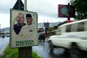 Electoral campaign poster of President Julius Maada Bio and his running mate, Vice President Juldeh Jalloh, seen ahead of presidential election in Freetown, Sierra Leone June 22, 2023. REUTERS/ Cooper Inveen