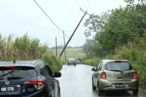 Cars pass a leaning power pole after Tropical Storm Bret passed north of the island, in St. Thomas, Barbados June 22, 2023. REUTERS/Nigel R. Browne