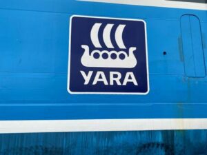 The Yara International company logo is seen on Yara Birkeland, the world’s first fully electric and autonomous container vessel, in Oslo, Norway November 19, 2021. REUTERS/Victora Klesty