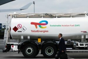 FILE PHOTO: A TotalEnergies tanker truck with sustainable aviation fuel (SAF) is pictured during the 54th International Paris Airshow at Le Bourget Airport near Paris, France, June 19, 2023. REUTERS/Benoit Tessier/File Photo
