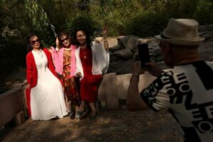 FILE PHOTO: Women pose for pictures at a park during the Dragon Boat festival holiday, in Beijing, China, June 4, 2022. REUTERS/Tingshu Wang/File Photo
