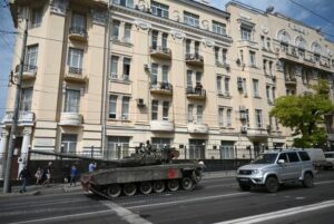 Combatientes del grupo mercenario privado Wagner se despliegan en una calle cerca de la sede del Distrito Militar Sur en la ciudad de Rostov del Don, Rusia. 24 de junio, 2023. REUTERS/Stringer
