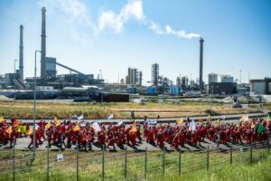 Protesters and environmental activists take part in a protest ‘People vs Polluters’ led by Greenpeace Netherlands against Tata Steel, in Ijmuiden, Netherlands June 24, 2023. Tengbeh Kamara/Greenpeace/Handout via REUTERS