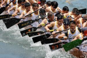 Participants compete in a dragon boat during the annual Tuen Ng or Dragon Boat Festival at Aberdeen fishing port in Hong Kong, China June 22, 2023. REUTERS/Tyrone Siu