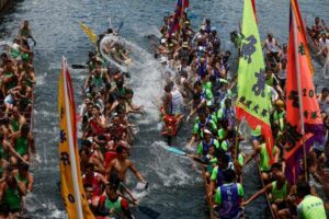 Participants splash water during a ceremony in between races during Tung Ng or Dragon Boat Festival at Aberdeen fishing port in Hong Kong, China June 22, 2023. REUTERS/Tyrone Siu