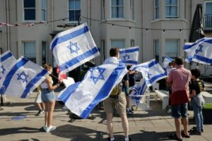 Demonstrators protest outside The Old Ship Hotel on the day Arnon Milchan, a Hollywood producer and Israeli citizen is expected to provide testimony, in Brighton, Britain June 25, 2023. REUTERS/Carlos Jasso