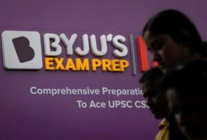 FILE PHOTO: People walk past an advertising hoarding of Byju’s, an education technology company and one of India’s biggest startup, outside one of its branches in New Delhi, India, June 23, 2023. REUTERS/Adnan Abidi/File Photo