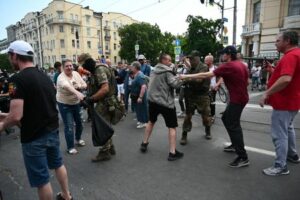 Supporters and opponents of Wagner private mercenary group have an argument as Wagner fighters are deployed near the headquarters of the Southern Military District in the city of Rostov-on-Don, Russia, June 24, 2023. REUTERS/Stringer