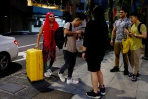Drag performer Yeo Sam Jo, 35, whose stage name is JoJo Sam Clair, speaks to people as he arrives for a performance at a local club in Singapore June 15, 2023. REUTERS/Edgar Su