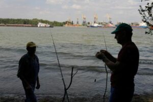 Two men prepare to fish across the Danube from the port of Izmail, in Plauru, Romania, September 5, 2023. REUTERS/Andreea Campeanu