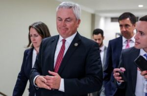 FILE PHOTO: U.S. Representative James Comer (R-KY) is flanked by reporters after a closed door House Intelligence Committee hearing to investigate the origins of the FBI’s Trump-Russia investigation, on Capitol Hill in Washington, U.S., June 20, 2023. REUTERS/Evelyn Hockstein/File Photo