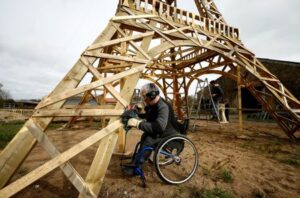 El carpintero francés Frederic Malmezac y Sylvain Bouchard trabajan en una réplica de 16 metros de la Torre Eiffel construida con madera reciclada que esperan exponer a lo largo del recorrido del relevo de la antorcha olímpica y en los emplazamientos olímpicos de los Juegos Olímpicos y Paralímpicos de París 2024, en La Chevroliere, cerca de Nantes