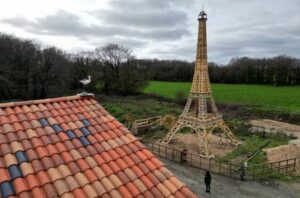 Una vista de dron muestra una réplica de 16 metros de la Torre Eiffel a partir de madera reciclada construida por el carpintero francés Frederic Malmezac y Sylvain Bouchard, que esperan exponer a lo largo del recorrido del relevo de la antorcha olímpica y en las sedes olímpicas de los Juegos Olímpicos y Paralímpicos de París 2024, en La Chevroliere, cerca de Nantes