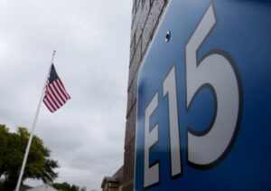 A sign advertising E15, a gasoline that contains 15% ethanol,