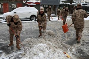 Paramilitary police officers remove snow from a road following snowfall in Beijing, China February 21, 2024. REUTERS/Florence Lo