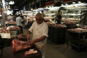 FILE PHOTO: A butcher slices meat as he waits for customers inside Athens’ main meat market, Greece August 28, 2015. REUTERS/Stoyan Nenov/File Photo