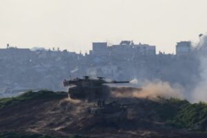 An Israeli tank fires into the Gaza Strip from Israel, amid the ongoing conflict between Israel and the Palestinian Islamist group Hamas, as seen from Israel, February 21, 2024. REUTERS/Susana Vera