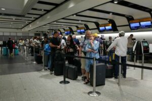 FILE PHOTO: Passengers queue for the check-in desk at Heathrow Terminal 3 in London, Britain, August 22, 2023. REUTERS/Maja Smiejkowska/File Photo