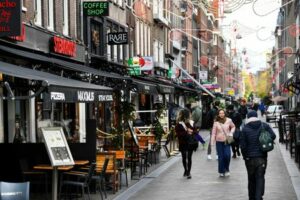 FILE PHOTO: People walk past restaurants and bars in Amsterdam, Netherlands October 14 2020. REUTERS/Piroschka van de Wouw/File Photo