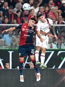 Foto de archivo de Johan Vásquez (22) disputando el balón con Christian Pulisic durante un partido de la serie A de Italia entre Genoa y Milan. Estadio Comunale Luigi Ferraris, Genoa, Italia. 7 de octubre de 2023.