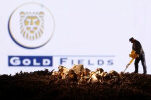 A small toy figure and gold imitation are seen in front of the Gold Fields logo in this illustration taken November 19, 2021. REUTERS/Dado Ruvic/Illustration/file photo