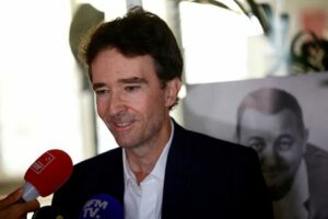 FILE PHOTO: Antoine Arnault, overseeing Image and Environment for LVMH, talks to journalists, next to a poster with a portrait of late French comic Coluche, during a joint press conference at the headquarters of the charity food distribution Association “Les Restos Du Coeur” (Restaurants of the Heart) in Paris, after the French luxury group LVMH said on Monday it would contribute to the association and pledged 10 million euros, France, September 5, 2023. REUTERS/Sarah Meyssonnier/File Photo