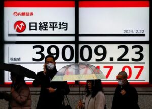 Passersby stand in front of electronic screens displaying Japan’s Nikkei share average, which surged past an all-time record high scaled in December 1989, outside a brokerage in Tokyo, Japan February 22, 2024. REUTERS/Issei Kato