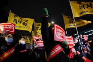 Doctors take part in a protest against a plan to admit more students to medical school, in front of the Presidential Office in Seoul, South Korea, February 22, 2024. REUTERS/Kim Soo-Hyeon