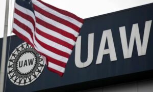 An American flag flies in front of the United Auto Workers union logo on the front of the UAW Solidarity House in Detroit, Michigan, September 8, 2011. REUTERS/Rebecca Cook/File Photo