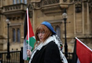 A woman looks on as campaigners queue to lobby MPs in Parliament ahead of a debate to hold a vote for a ceasefire in Gaza, amid the ongoing conflict between Israel and the Palestinian Islamist group Hamas, in London, Britain, February 21, 2024. REUTERS/Isabel Infantes