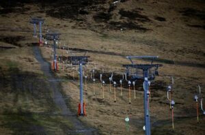 Una vista muestra un remonte cerrado en medio de la falta de nieve en un día templado de invierno boreal en la estación de esquí de Hautacam en Beaucens, Altos Pirineos, suroeste de Francia. 20 de febrero de 2024. REUTERS/Stephane Mahe