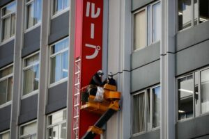 ARCHIV: Arbeiter mit Schutzmasken arbeiten vor einem Gebäude in einem Geschäftsviertel, inmitten des Ausbruchs der Coronavirus-Krankheit (COVID-19) in Tokio, Japan, 18. Januar 2022. REUTERS/Kim Kyung-Hoon
