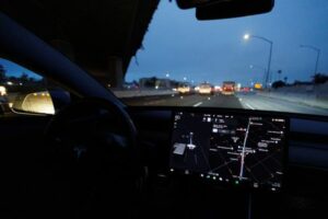 FILE PHOTO: A Tesla Model 3 vehicle drives on autopilot along the 405 highway in Westminster, California, U.S., March 16, 2022. REUTERS/Mike Blake/File Photo