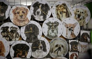 Dog themed clocks are seen for sale on a trade stand at a dog show in Birmingham, Britain, March 9, 2024. REUTERS/Phil Noble/File Photo