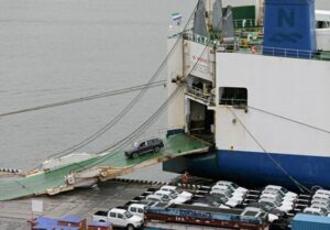 FILE PHOTO: A new car produced by Chinese automaker Geely leaves a ship at a commercial port in Vladivostok, Russia August 25, 2023. REUTERS/Tatiana Meel/File Photo