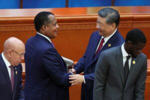 Republic of the Congo President Denis Sassou Nguesso and Chinese President Xi Jinping shake hands at the opening ceremony of the ninth Forum on China-Africa Cooperation (FOCAC) Summit, at the Great Hall of the People in Beijing, China September 5, 2024. REUTERS/Florence Lo