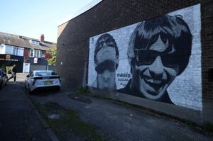 FILE PHOTO: A man walks past a mural of Oasis band members Liam and Noel Gallagher by artist Pic.One.Art on the side of Sifters record shop in the Burnage area of Manchester, Britain, August 31, 2024. REUTERS/Phil Noble/File Photo