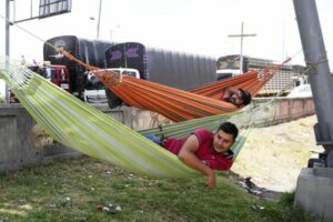 FOTO DE ARCHIVO. Conductores descansan en hamacas durante un bloqueo