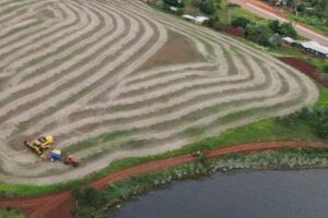 A drone view shows rural workers using agricultural machinery during the soybean harvesting on the Nonoai indigenous land, in Nonoai, state of Rio Grande do Sul, Brazil, April 4, 2024. REUTERS/Diego Vara