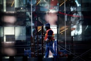 FILE PHOTO: A construction worker works atop the One Times Square building which is being rebuilt for a new commercial real estate space in Manhattan in New York City, U.S., February 7, 2024. REUTERS/Mike Segar/File Photo