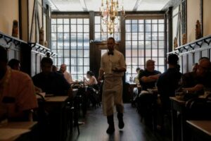 FILE PHOTO: A waiter walks among diners at Peter Luger Steak House in Brooklyn, New York City, U.S., August 12, 2021. REUTERS/Andrew Kelly/File Photo