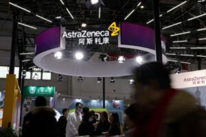 FILE PHOTO: People walk past the AstraZeneca booth during the first China International Supply Chain Expo (CISCE) in Beijing, China November 28, 2023. REUTERS/Florence Lo/File Photo