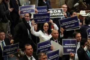 FOTO DE ARCHIVO. Congresistas colombianos de partidos de oposición sostienen carteles que dicen “Somos oposición, fuera corrupción” durante la apertura de la nueva sesión del Congreso, en Bogotá, Colombia 20 Julio, 2024. REUTERS/Nathalia Angarita