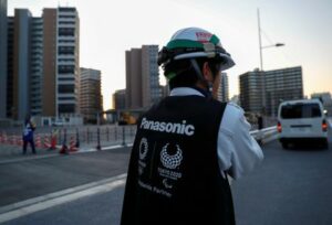 FILE PHOTO: A worker wears a jacket with the logo of Panasonic, Tokyo 2020 Olympic and Paralympic Games’ partner, as he walks at an under-construction site of the Olympic villages in Tokyo, Japan March 25, 2020. REUTERS/Issei Kato