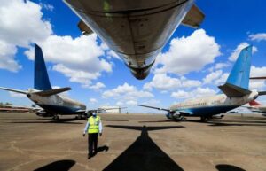 A Kenya Airports Authority worker inspects planes during an auction after previous owners abandoned them at the Jomo Kenyatta International Airport in Nairobi, Kenya, November 17, 2021. REUTERS/Thomas Mukoya/File Photo