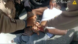 Miami Dolphins receiver Tyreek Hill is handcuffed by police officers during a traffic stop in Miami Gardens, Florida, U.S., September 8, 2024, in this still image taken from a police bodycam video. Miami-Dade Police Department/Handout via REUTERS