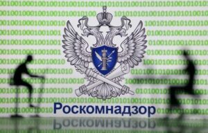 Miniatures of people with computers are silhouetted in front of binary codes and Roskomnadzor (RKN) logo in this illustration taken, April 23, 2024. REUTERS/Dado Ruvic/Illustration/File Photo