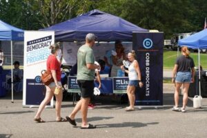 FILE PHOTO: People pass the Cobb Democrats booth at the Pigs and Peaches country festival in Kennesaw, Georgia, U.S. August 17, 2024. REUTERS/Megan Varner/File Photo