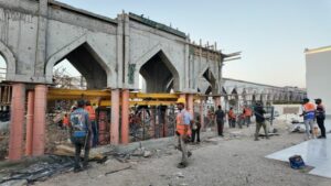 Workers take part in restoration at the Sahaba Mosque, on the first anniversary of the deadly flood which damaged the mosque and devastated the city, in Derna, Libya, September 10, 2024. REUTERS/Mohamed Emnena