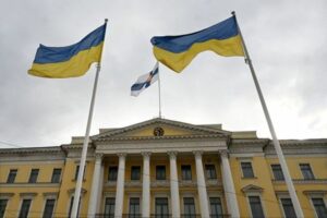 FOTO DE ARCHIVO: Banderas ucranianas ondean en honor del Día de la Independencia de Ucrania en la Plaza del Senado frente al Palacio de Gobierno en Helsinki, Finlandia, 24 de agosto de 2024. Lehtikuva/Jussi Nukari/via REUTERS/Foto de archivo